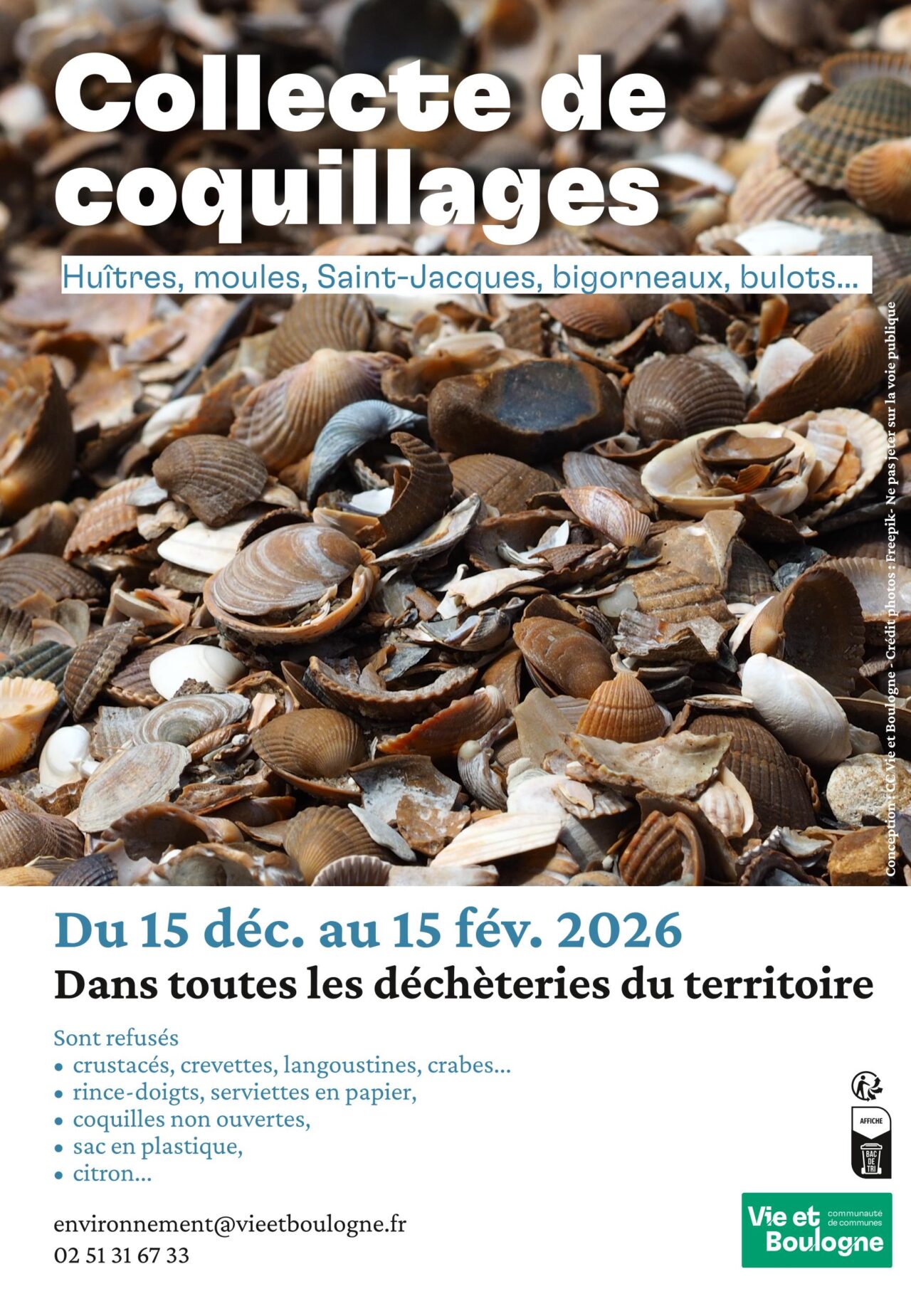 La collecte de coquillages (moules, saint-Jacques, huîtres, bigorneaux, bulots…) sera accessible sur toutes les déchèteries du territoire du lundi 15 décembre 2025 au 15 février 2026.