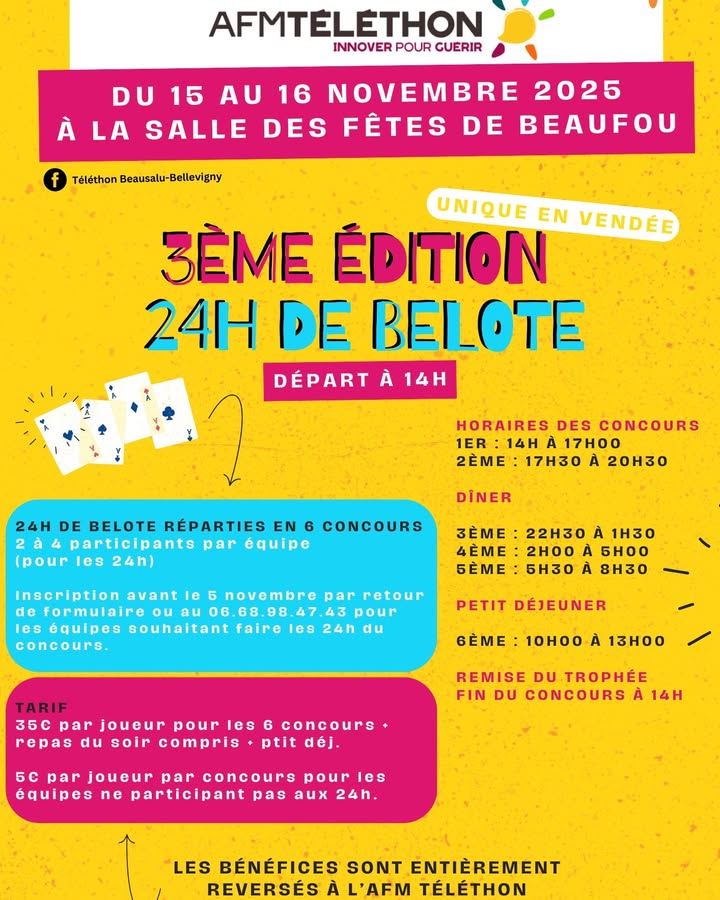Le club des séniors « Le Sourire » des Lucs sur Boulogne organise un concours de belote ouvert à tous, salle n°1 du Clos Fleuri, le samedi 22 Novembre 2025.